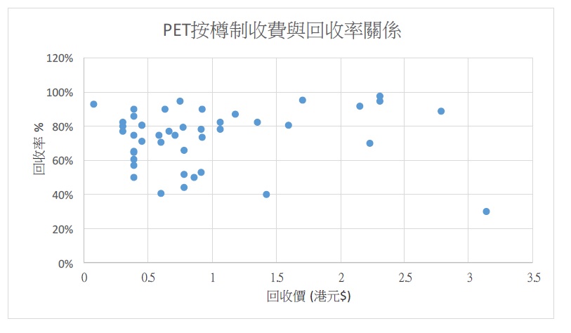 若計及按樽收費與回收率的關係,發現收費在1元或以上者,回收率平均能達到77%。然而,按樽費愈高、未必得出回收率愈高的必然關係,還要視乎當地的廢物管理政策目標及配套而定。