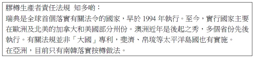 綠惜地球稱,本港膠樽棄置量持續上升,回收情況並不理想,2016年回收率僅得8.5%,加上中國收緊廢塑料進口,故按樽費可考慮以1元作參考點,大力促進回收成效。然而,本會強調,政府務須做好監督,防範流入外地銷售的空膠樽,騙取按金。當局亦應要求飲品生產商改良膠樽設計,採用單一物料,以利回收。