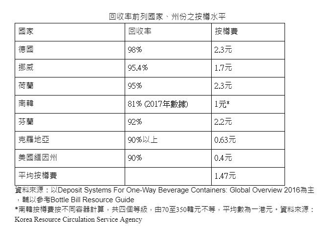 綠惜地球分析了全球25個實施膠樽按樽制國家/城市的回收表現,發現平均回收率為73%,而德國、挪威、荷蘭等國,回收率均達到95%的高水平。