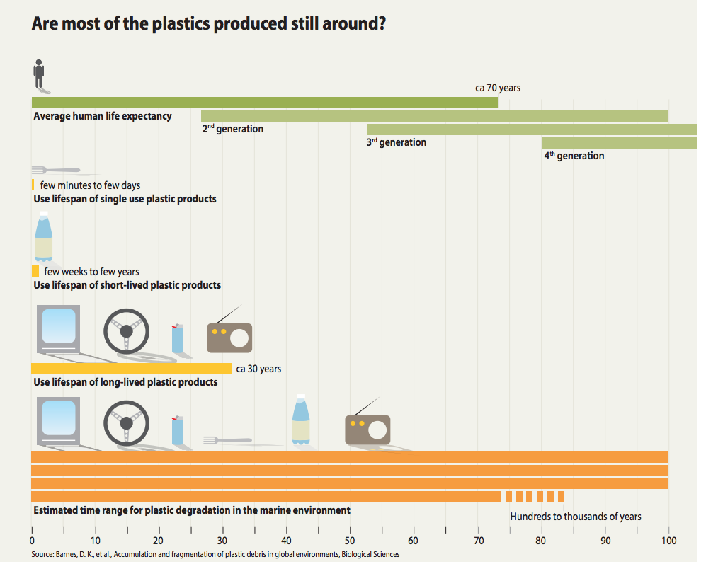 類似的新聞會逐漸為讀者淡忘,因為新鮮感會退去,漸漸由屢見不鮮,變為見怪不怪。常識告訴我們,塑料壽命以百年起跳,長壽者四、五百年也屬等閒。塑料產品大規模生產,也不過六、七十年歷史,今日大家在海邊、山野撿到完好的廢包裝和膠樽,正常不過。就是說,待我們四、五代子孫出生時(如果那時地球未被人類毁掉),這些廢塑膠仍然長存世上。
