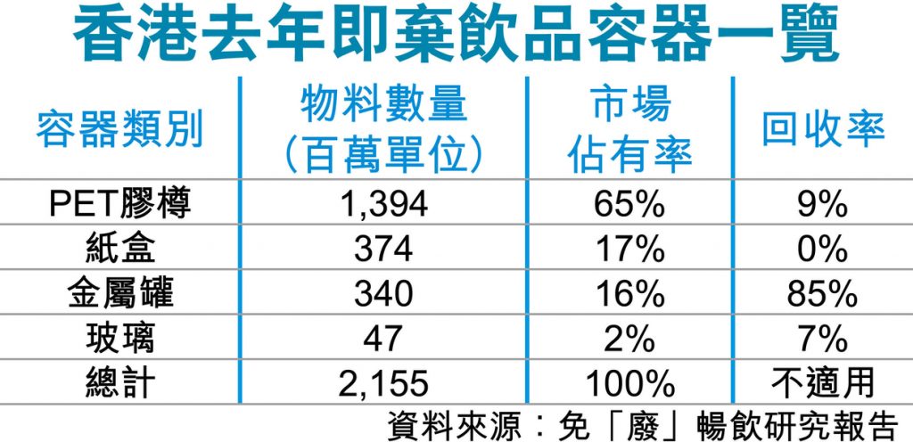 香港民間上周四公布首份即棄飲品包裝報告,揭示香港去年生產的即棄飲品容器,超過21億件。把這個天文數字拉到生活,就是香港人平均每三天便會喝掉兩瓶膠樽、鋁罐、紙盒或者玻璃樽的即棄包裝飲料;而飲完的樽樽罐罐,8成以上被扔到堆填區。
