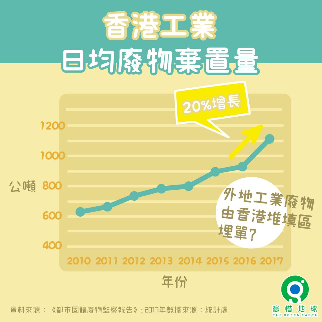 (2018年12月24日新聞稿) 經常說香港沒有工業,但2017年香港工業廢物棄置量,竟較2016年大幅增長20%,打平了1991年的紀錄,並遠高於「家居廢物」(0.1%)、「都市固體廢物」(3.7%)和「商業廢物」(6.3%)的增幅。綠惜地球警告,這當中不乏來自外地的廢物,環保部門有責任拒諸門外。而未有垃圾收費前,這些外來廢物即使在香港傾倒,幾近零成本,並不公平。