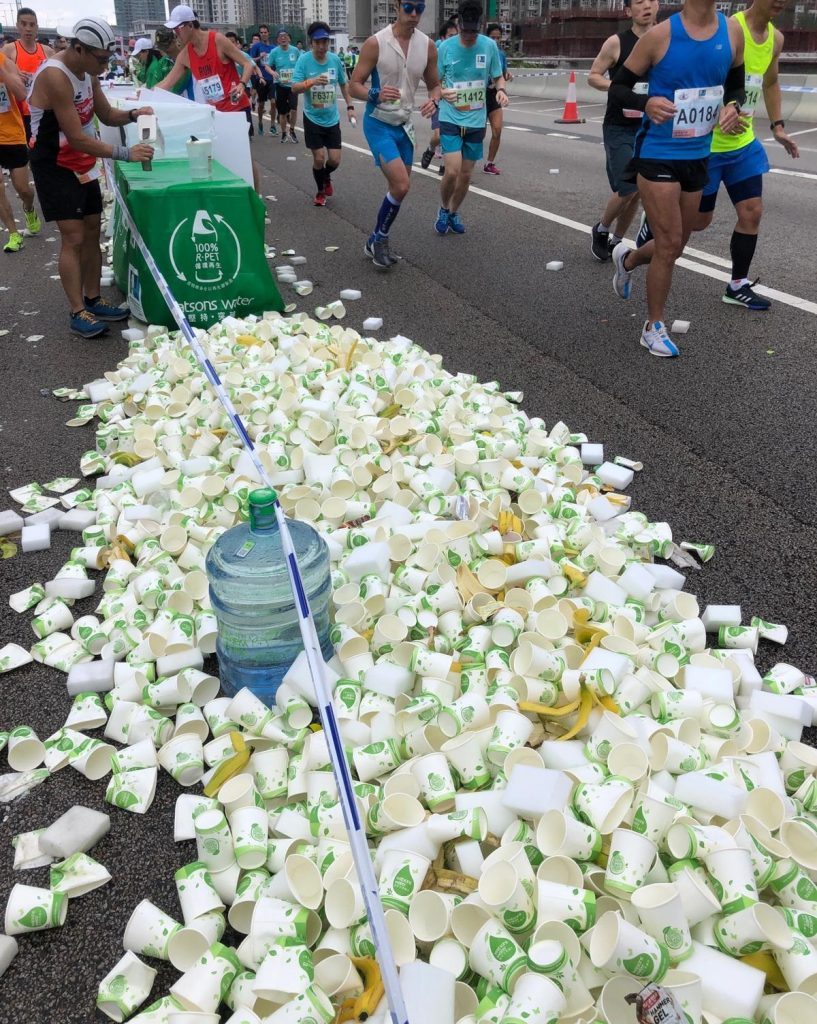 剛結束的渣馬有74,000人參賽,論人數和熱度,堪稱我城盛事。馬拉松是個選手追趕時間、造成績的競賽,所以往往與「即棄」二字劃上等號。怎麼說呢?從新聞畫面不難看到,跑友每每途經滿桌水杯的水站,幾乎都會補水。但喝一口的水,便把紙杯扔掉,一個人扔是一個,7萬多人扔便是7萬多個;而整場活動下來,估計耗用的紙杯超過32萬個。
