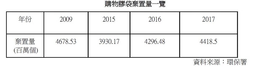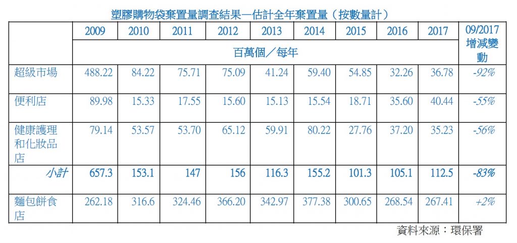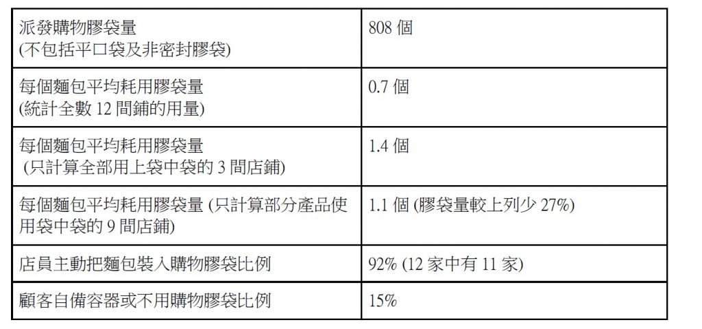 2017年「麵包餅食店」類購物膠袋棄置量達2.67億個,是計劃首階段全部徵費對象——超市、便利店、健康護理和化妝品店——丟棄總量的2.3倍。而自膠袋徵費計劃2009年實施以來,麵包購物膠袋的每年棄置量,從沒低過09年水平,反映計劃未能壓抑其用量。