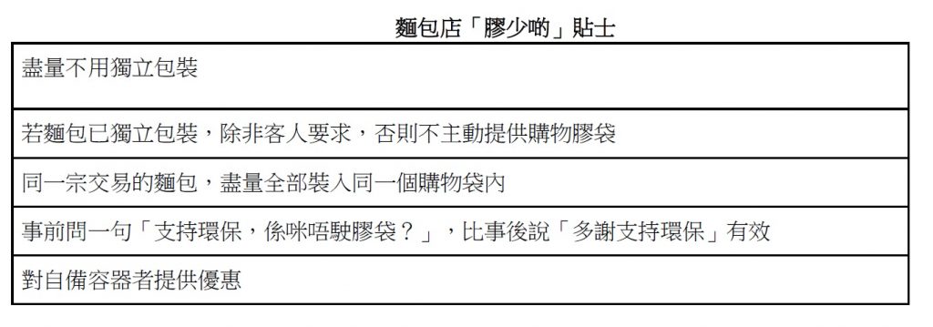 有店舖因衛生之名使用獨立包裝,本會質疑其實是想要加快結帳流程、做多生意為實。因為也不少店舖沒用獨立包裝平口袋,把待售麵包置於有蓋層架上,不存在衛生問題。本會提出以下減用膠袋建言,促請麵包店採納: