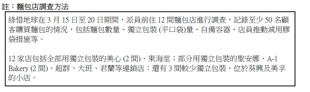 然而,即使這個數字令人咋舌,本會認為它未能反映現實。綠惜地球近日調查了12家麵包店 (註),紀錄685位顧客購買1,163個麵包的消費行為,發現濫發膠袋問題嚴重,包括有顧客買8個獨立包裝麵包,卻被店員用3個購物膠袋盛載,即一次購物總共用上11個膠袋。如果環保署把獲豁免的平口袋納入計算,相關膠袋垃圾將激增至5億個以上。