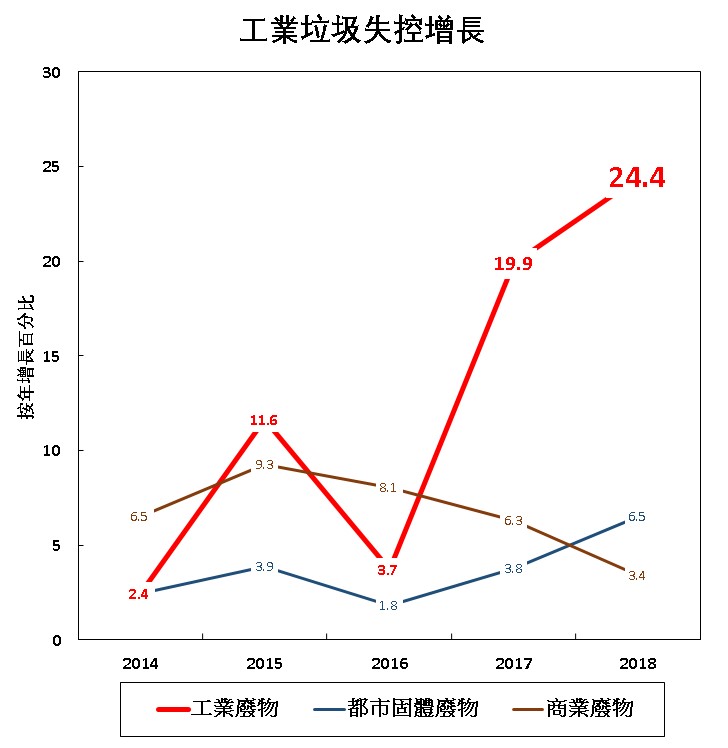 一年過去,2018年的工業垃圾量更打破記錄,達1380公噸或24.4%的增幅。本會發言人稱,「香港正受到內外夾擊,一方面多了棄置本港的外來垃圾;二來在內地收緊進口標準下,推高了本地廢紙、廢膠的棄置數量。」本會提醒,當局應落力防堵外來低端廢品流入,同時加強本地的回收及再造能力,才能遏止失控的工業垃圾增長。