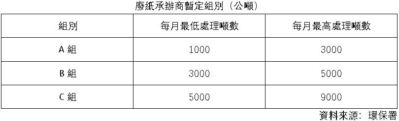 政府提供財政支援,經常因「分餅仔」不均起爭議。這次計劃畫分三個組別、每個組別設下每月最高及最低的廢紙處理量,有關承辦商不得回收超逾該組別上下限的廢紙噸數,以防堵大財團壟斷,讓相當的業者有入場機會(見表)。