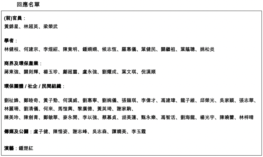 評分工作得到61位來自不同界別的代表響應 (名單見下)。五條問卷提問如下: