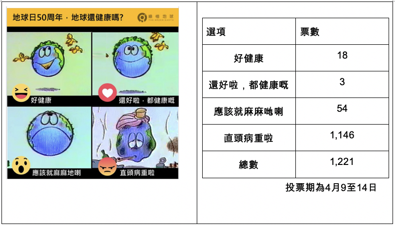 此外,綠惜地球在機構專頁同時發起了公眾投票,有超過1,200人參與為地球先生做「體檢」。結果顯示, 接近94% (1,146人) 指「直頭病重啦」,若計入投「應該就麻麻地喇」的54人,對地球生態抱悲觀者有壓倒性的98%,情況令人憂慮。