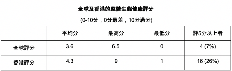 受訪者同時普遍不滿意本港的整體生態健康,有74% (45人)認為不合格者,但表示合格者的比例有26% (16人),高於全球水平。