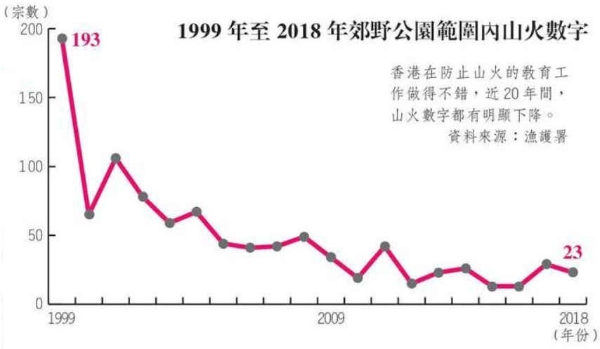 防止山火教育的工作,我們曾經做得不錯。無論是整體郊野或郊野公園範圍內的山火數字,近20 年間其實都有明顯下降。然而,自去年12 月開始有「死灰復燃」迹象,山火頻仍,規模也大,只計最嚴重的3 場山火,估算波及超過400 公頃,相當於21 個維園的面積,也燒掉不少10 至20 年內的重點植林區,情况慘烈。防火教育工作必須重新加強,讓公眾參與植林工作,提升大眾保護樹林的意識,甚至也可鼓勵舉報非法生火。山火事件的起因及環境資料也必須有系統地分析和調查,協助執法並針對性地制訂防火策略及法規。