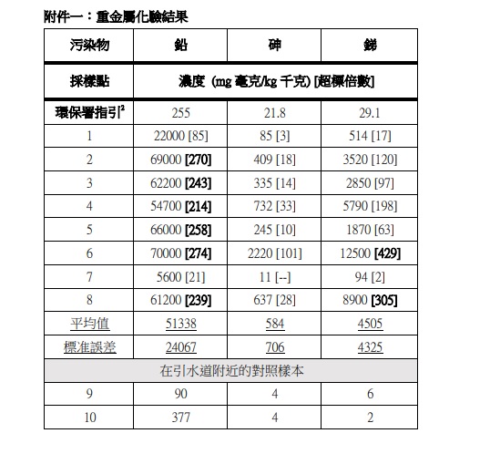 陳竟明博士以「極度污染」形容情況嚴峻:「化驗結果反映泥土表面已全面受污染,而且程度遠超預期,比本港電子垃圾拆解場更嚴重。估計這些鉛粒在長年『無皇管』情況下,釋出重金屬,並滲透至泥土中。地政總署及環保署有責任全面界定受污染的範圍及程度,向公眾交代。」