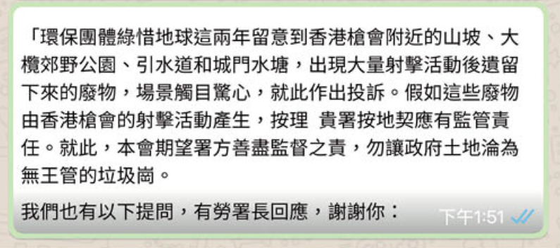 「環保團體綠惜地球這兩年留意到香港槍會附近的山坡、大欖郊野公園、引水道和城門水塘,出現大量射擊活動後遺留下來的廢物,場景觸目驚心,就此作出投訴。假如這些廢物由香港槍會的射擊活動產生,按理 貴署按地契應有監管責任。就此,本會期望署方善盡監督之責,勿讓政府土地淪為無王管的垃圾崗。