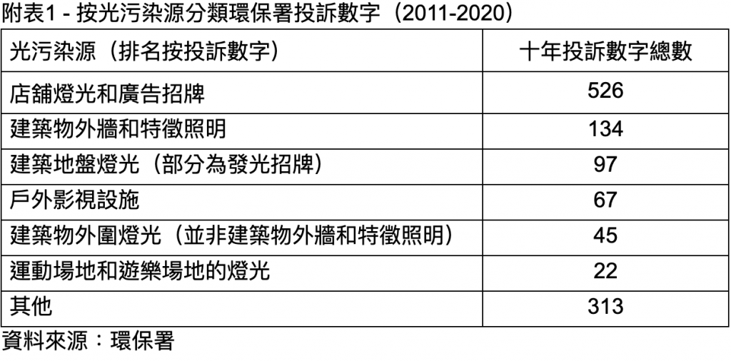 附表1 – 按光污染源分類環保署投訴數字(2011-2020)