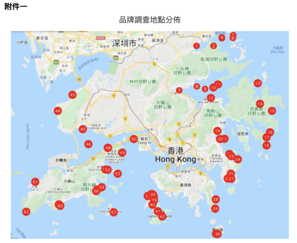 本會整理了最新一份 (2020年11月至2021年11月) 共116場品牌調查的數據,調查地點遍布全港(見附件一),北至鴨洲、吉澳,南抵蒲台島,東及鹹田灣、西貢白腊仔,西達龍鼓灘及大嶼山的分流,每場平均撿獲311個膠樽,最多的一場更達1,913個 (鹹田灣),反映膠樽垃圾無處不在。