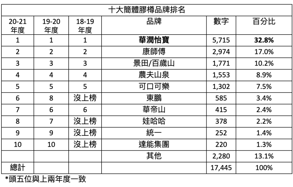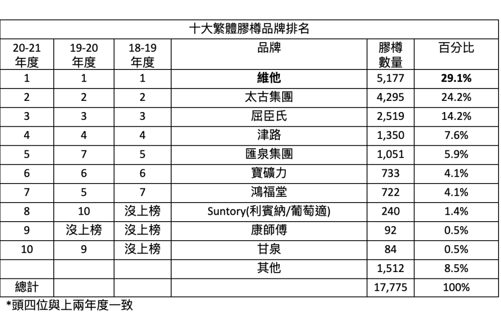 至於繁體品牌排名,頭四位連續三個年度保持不變,分別為維他 (29.1%)、太古集團 (24.2%)、屈臣氏 (14.2%)及津路(7.6%),而前三大牌子的膠樽量,佔總量的67.5%。