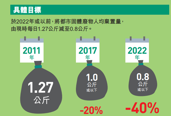 黃錦星2013年發表的《香港資源循環藍圖2013-2022》,承諾把人均都市固體垃圾棄置量,由2011年的1.27公斤,削減兩成至2017年的1公斤,並且在2022年累積減廢四成至0.8公斤(見圖)。 不過,環保署最新公布的數據顯示,2017年人均廢物棄置量彈升了14%至1.45公斤。由於棄置量基數不減反增,意謂要到2022年減至0.8公斤,挑戰更大。