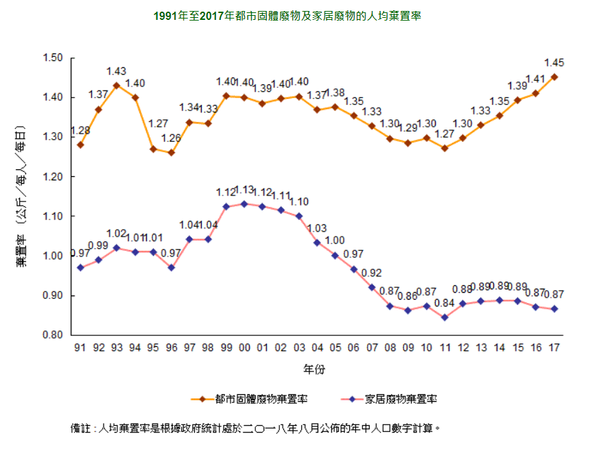 環保署發放2017年的減廢成績單《都市固體廢物監察報告》,指出港人平均每日扔掉1.45公斤垃圾,是1991年以來的最高紀錄。環境局局長黃錦星2013年開出2017年1公斤的中期減廢期票,宣告無法兌現。
