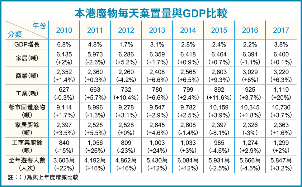 先說GDP,2017年本港GDP增長3.8%,但商業及工業的垃圾棄置量分別急增6.3%和20%,與前者完全不成比例。如果把時間綫往前拉長至2010年,可以看到本港在這8年間,只有3年的GDP增長高於商業廢物增幅,可見「經濟擴張」絕非解釋廢物增長的萬能key。