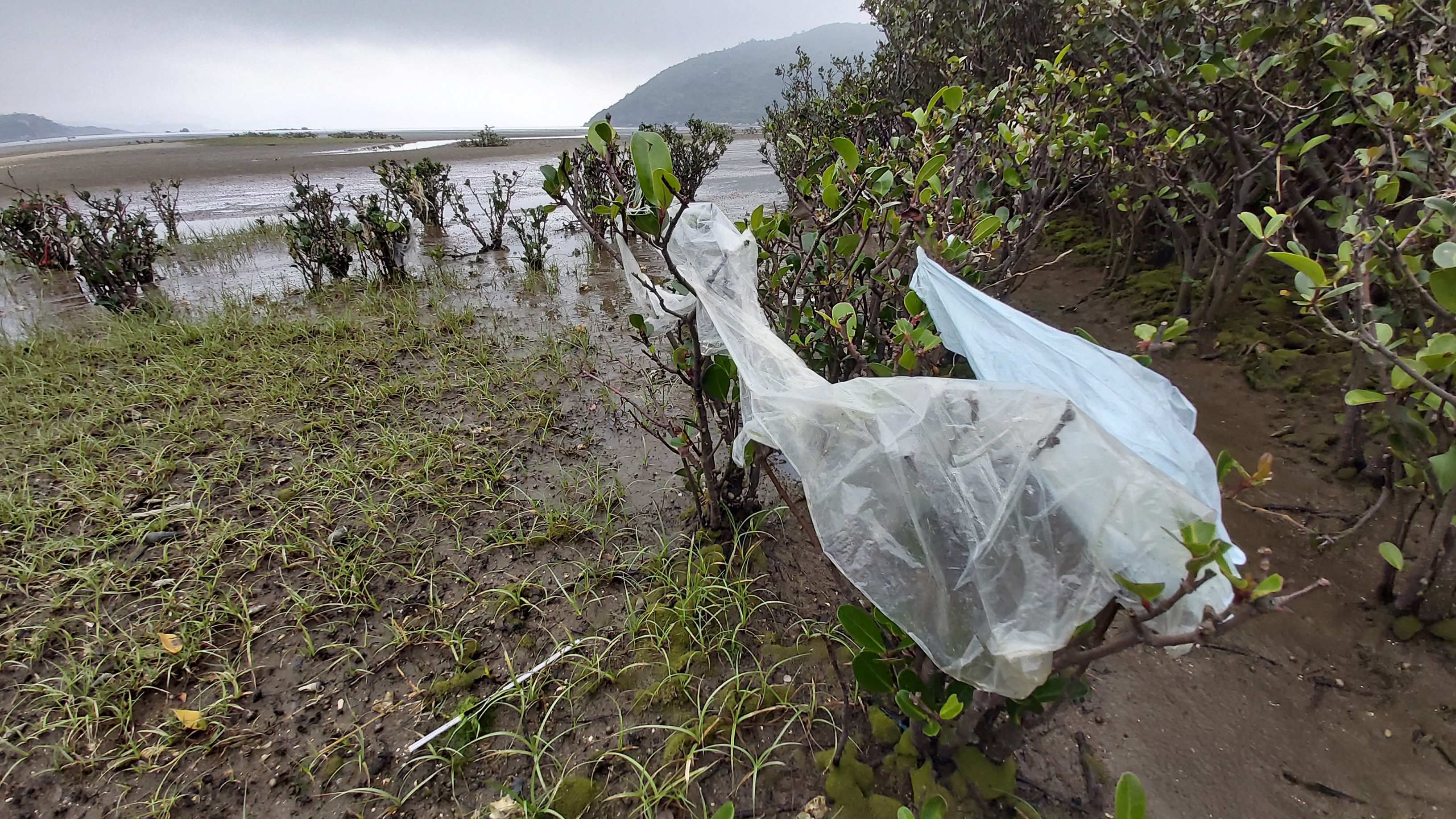 在大嶼山水口淨灘,看到圖中又長又破的膠袋,不禁想:真像披着白袍的索命幽靈,糾纏着死不放手,要奪紅樹的命。這樣令人戰慄的場面,在泥灘不難看到,放到世界各地也毫不稀奇。被纏上的,有時是紅樹、有時是海龜、有時是鯨豚海狗……