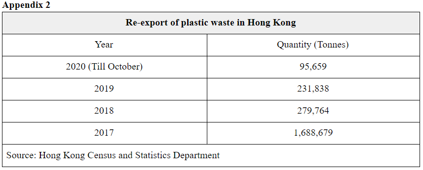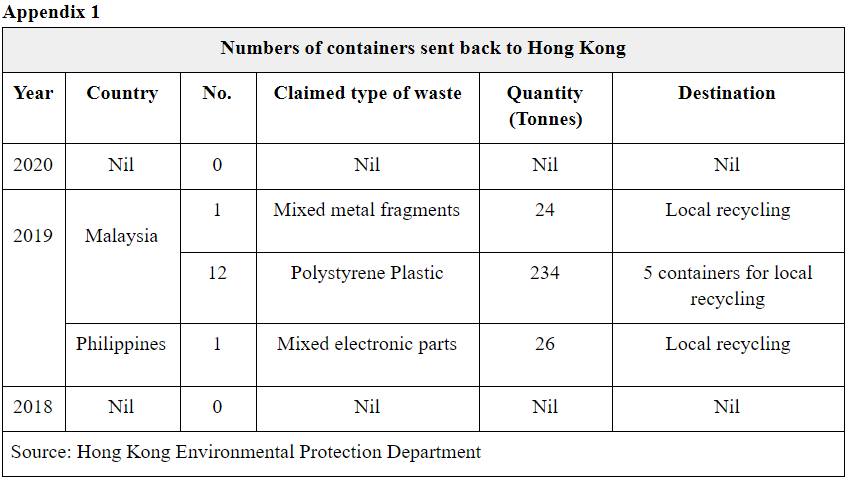 Hong Kong-related cases were also highlighted during the ENFORCE meeting in Geneva in October 2019. It was mentioned that Romania exported 123 waste slag containers to Xiamen Port in 2016, which were then ordered by the local authorities to send back to Hong Kong; eight of these containers were subsequently transferred to Port Kelang of Malaysia, but were rejected as hazardous waste. The Malaysian Environmental authorities requested the EPD not to ship the remaining 115 containers. The relevant containers went under the supervision of the EDP and were not shipped out of Hong Kong until late August 2020.