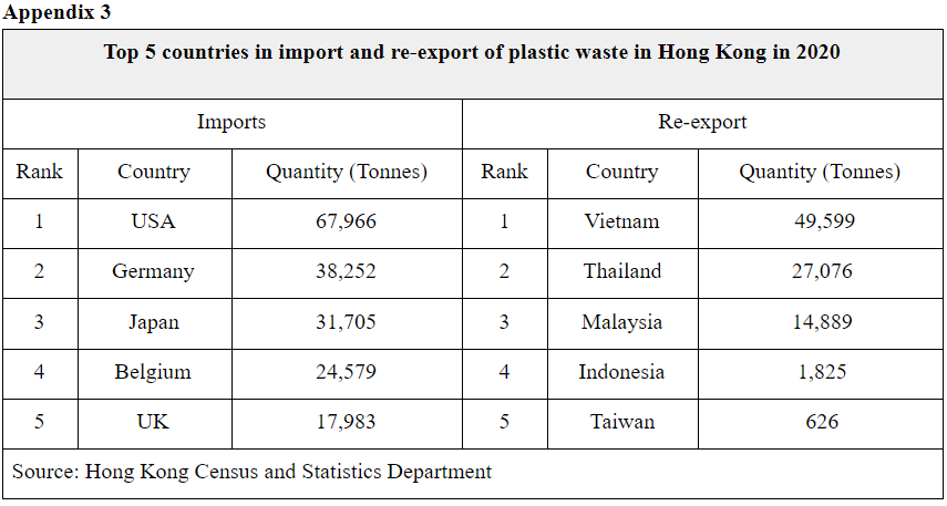 Hong Kong has been playing a pivotal role in global waste trade. The Report draws attention to the fact that China imported 45% of the world’s waste from 1992 to 2018. Since the import of “foreign waste” was banned from entering China in 2018, Hong Kong’s re-export volume of waste has plummeted by more than 80%. Yet, Southeast Asia and other developing economies have become the substitute dumping grounds. TGE examined the UN Comtrade database and realized that Hong Kong was the second and third largest source of plastic waste of Vietnam, Thailand and the Philippines respectively in 2019.