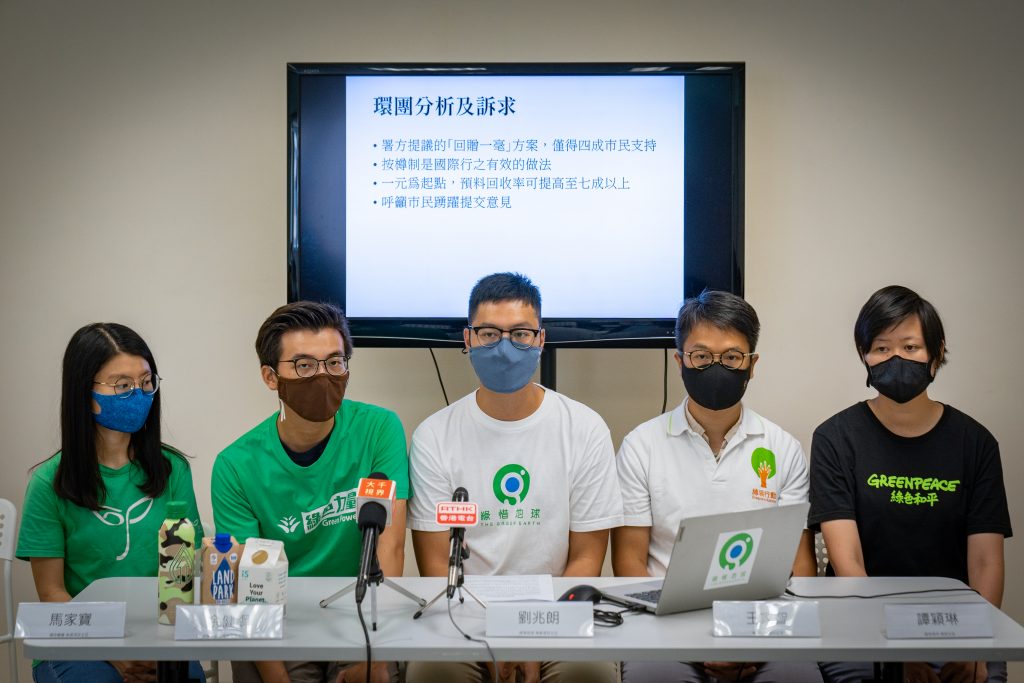 綠惜地球高級項目主任劉兆朗,建議採用全球行之有效的按樽制,以一元為起點。他說,「只要市民退還飲品容器便能全數取回按金,不會成爲經濟負擔;而按樽的行政程序亦與回贈相近,環保署不應以『行政負擔』作推搪藉口」。環保觸覺高級項目主任馬家寶指出,按樽制歷史悠久且成效顯著,現時運作成熟的玻璃樽按樽制(每個玻璃樽$1)下,2019-20年維他奶公司的可重用玻璃樽回收率達93%,可口可樂公司的更高達95%,質疑何不借鏡推行「按樽制」。