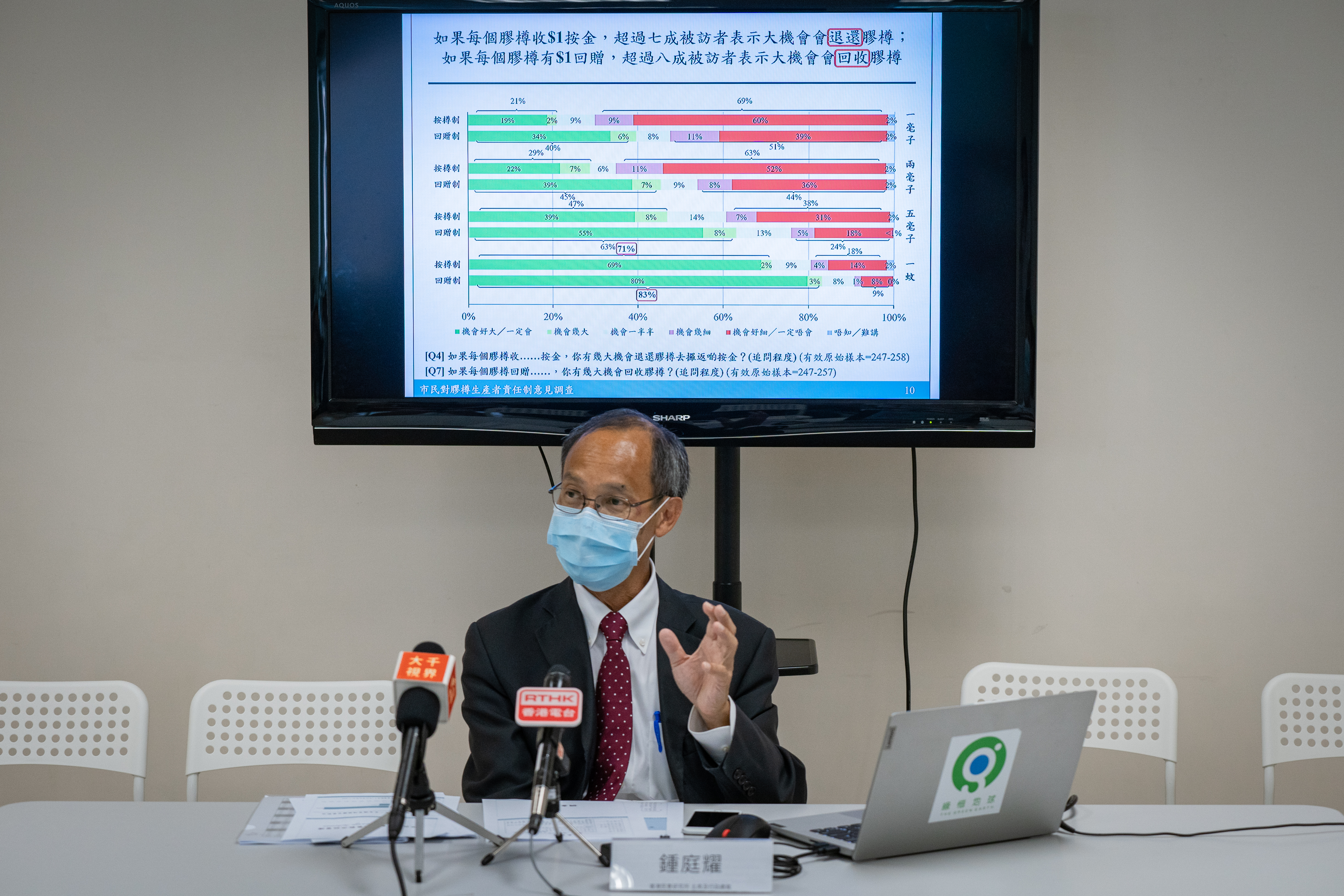 自公眾諮詢開始,無論是署方或民間的問卷,均只問及回贈或按樽其中一面意見,無法全面反映民意。因此,環保團體委託香港民意研究所,在4月23日至27日,以隨機抽樣方式,電話訪問1,008名18歲或以上香港居民,了解市民對膠樽生產者責任制的看法,包括回贈和按樽制、法規應否涵蓋紙包飲品、回收網絡地點等。