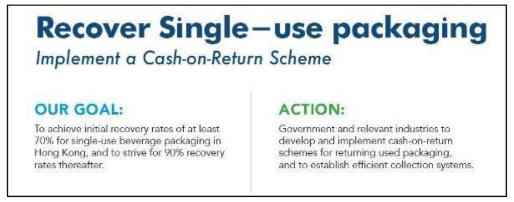 ● The Hong Kong government should implement the Plastic Beverage Container Producer’s Responsibility Scheme (PPRS) as soon as possible with a refund value of at least HK$1 per bottle.