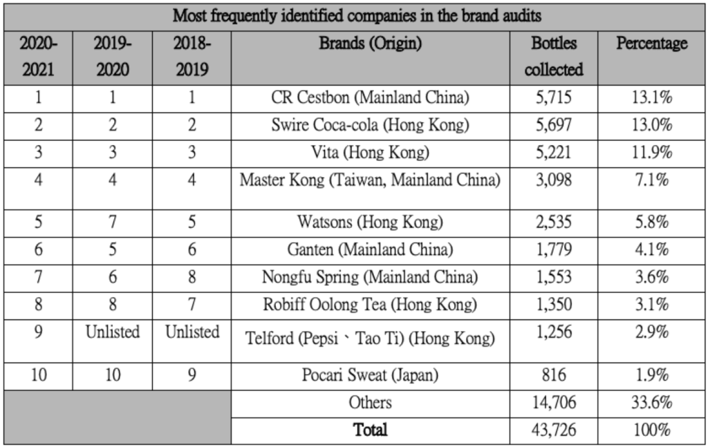 TGE has conducted the “Beverage Plastic Bottle Brand Audits” on shores and beaches for three consecutive years. This time, it has collected a record-breaking 43,726 waste plastic bottles. Consistent with the previous years, the top five plastic bottlers were CR Cestbon, Swire Coca- cola, Vita, Master Kong and Watsons Water, respectively, accounting for 52% of the total. The top 10 most identified brands in Hong Kong beaches 2020-2021 are tabulated below: